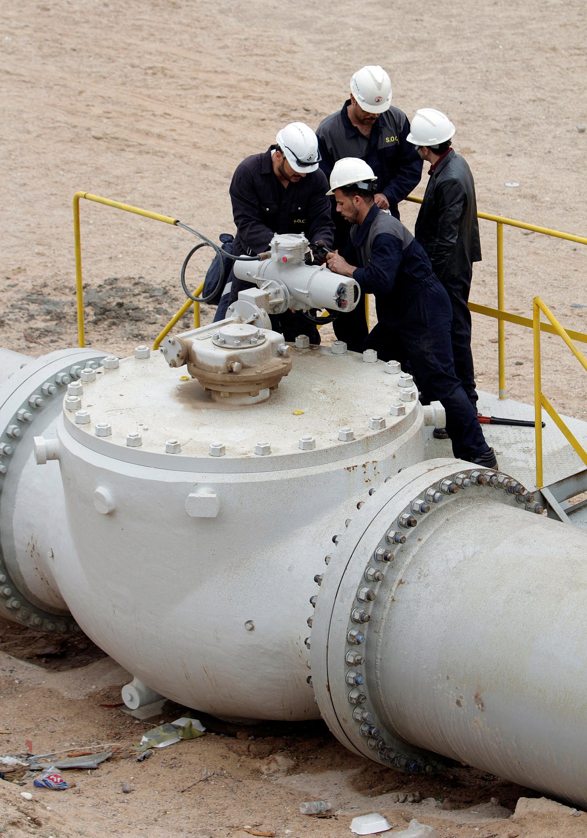Рабочие регулируют клапан нефтепровода на нефтяном месторождении Аль-Туба в Басре, Ирак. Картинка предоставлена Reuters