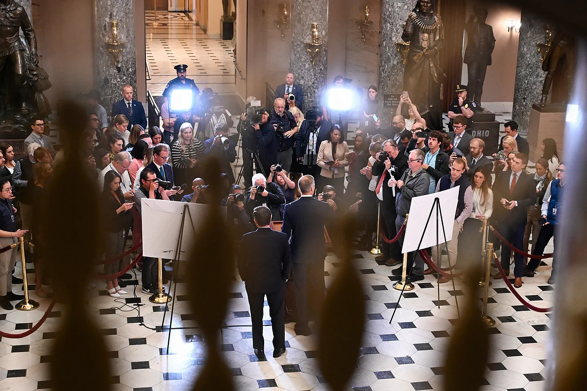 Журналисты наблюдают за тем, как лидер сенатского большинства Джон Тун, республиканец от Южной Дакоты, и спикер Палаты представителей Майк Джонсон, республиканец от Луизианы, проводят пресс-конференцию в Вашингтоне, округ Колумбия, в субботу. Картинка предоставлена AFP