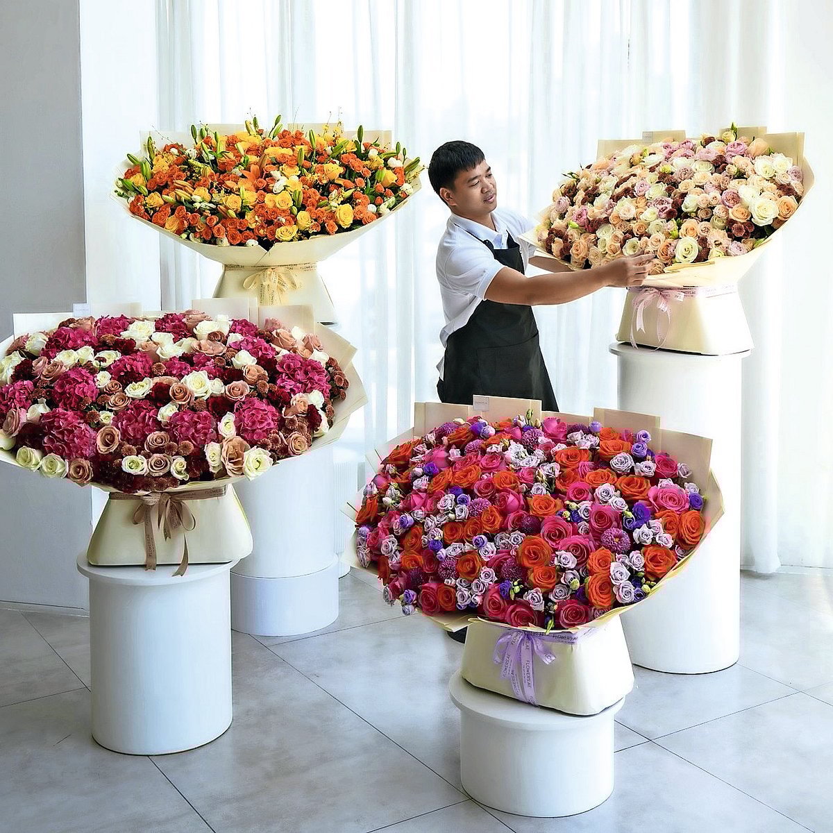 От великолепных букетов, от которых захватывает дух, таких как “Амара”, “Вероника”, “Диана” и “Айя”, каждый из которых олицетворяет роскошь и изобилие, до элегантных композиций, таких как “Сансет”, “Дюна”, “Бархат” и “Рубин”, состоящих из салфеток, шляпных коробок и ваз, – каждый дизайн был вдохновлен культурой и создан для того, чтобы дарить тепло и радость в ваш дом или в моменты дарения подарков.