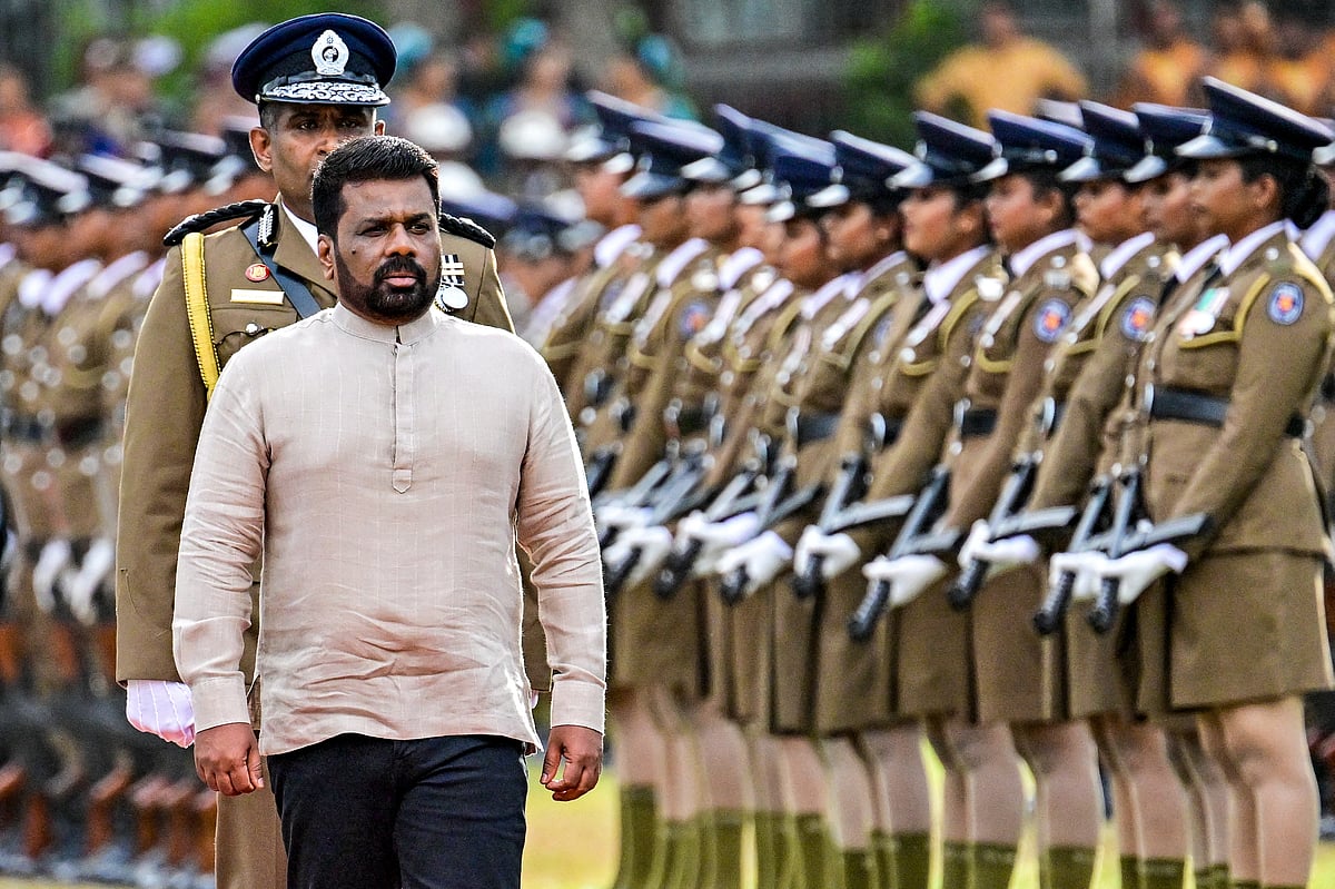 Президент Шри—Ланки Анура Кумара Диссанаяке (на фото) и генеральный инспектор полиции Приянта Вирасурия (на фото) осматривают строй почетного караула во время празднования Дня полиции в Коломбо, 3 сентября 2025 года. - Фото AFP