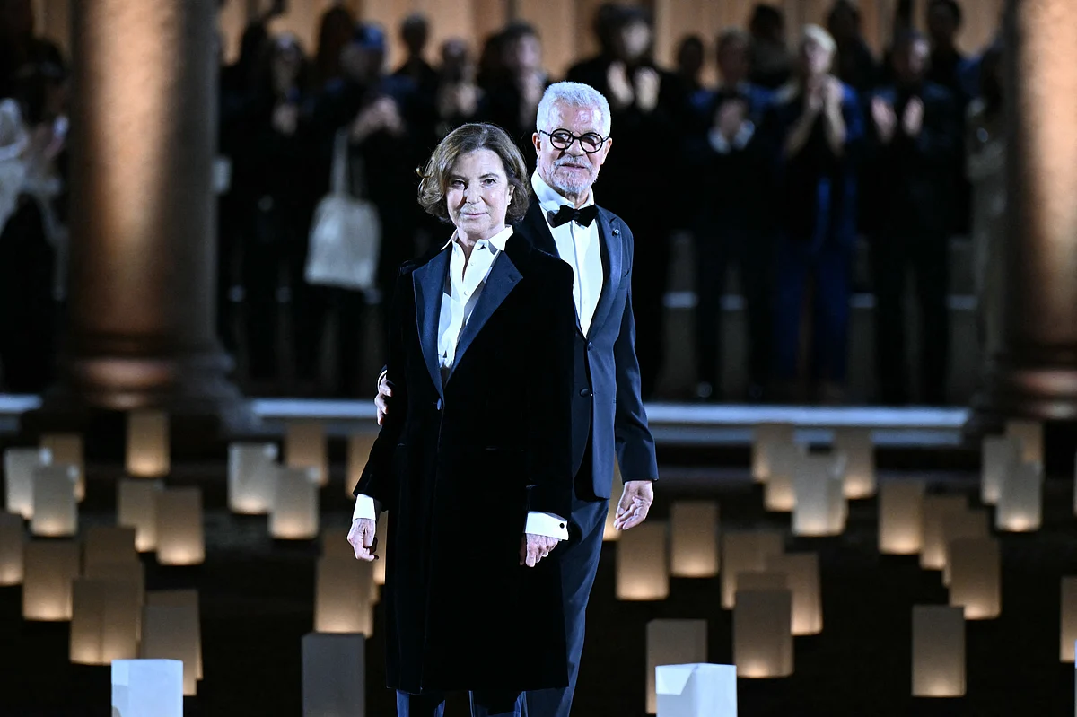Племянница Джорджио Армани Сильвана Армани и его давний коллега Лео Делл'Орко приветствуют публику в конце показа коллекции Giorgio Armani на Неделе женской моды в Милане Весна/лето 2026. Фото: Reuters Картинка предоставлена AFP/STEFANO RELLANDINI