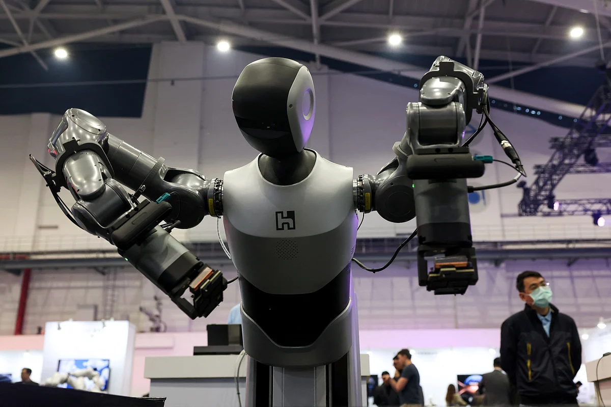 Промышленный робот-гуманоид с искусственным интеллектом на колесах будет показан на выставке Hon Hai Tech day в Тайбэе 21 ноября 2025 года. Картинка предоставлена AFP