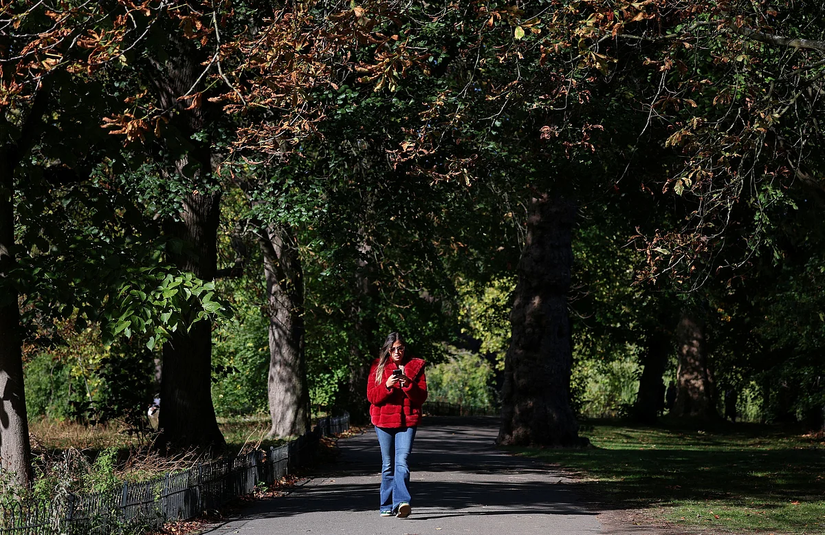 Женщина смотрит на свое мобильное устройство, прогуливаясь по Риджентс—парку в Лондоне, Великобритания, 22 сентября 2025 года.- Фото Reuters