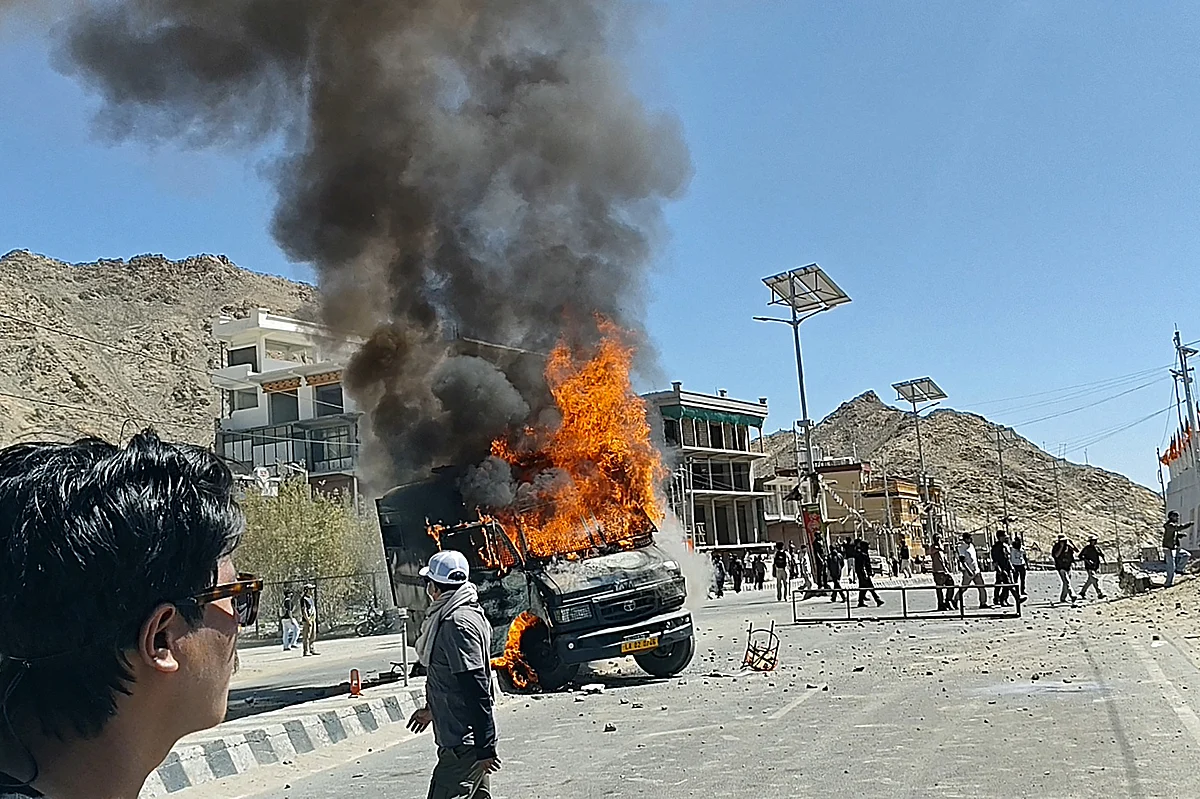 Демонстранты подожгли полицейскую машину на улице возле офиса партии Бхаратия Джаната в Лехе, 24 сентября 2025 года. — AFP