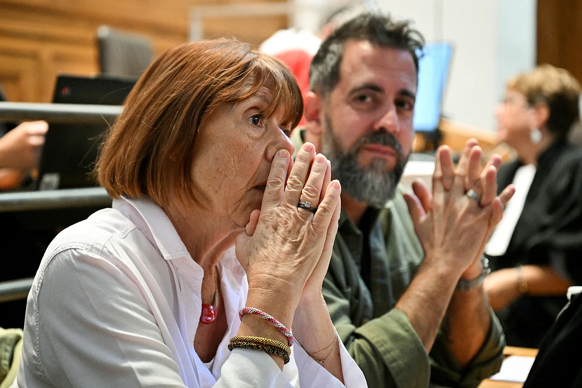 Жизель Пелико (слева) реагирует, сидя рядом со своим сыном Флорианом Пелико (справа) во время апелляционного процесса по делу об изнасиловании Мазан в здании суда Нима, южная Франция, 7 октября 2025 года. — AFP
