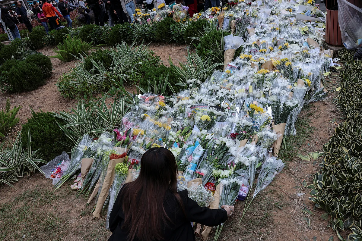 Женщина возлагает цветы перед пострадавшими от пожара жилыми домами в жилом комплексе Wang Fuk Court. Фото: Reuters