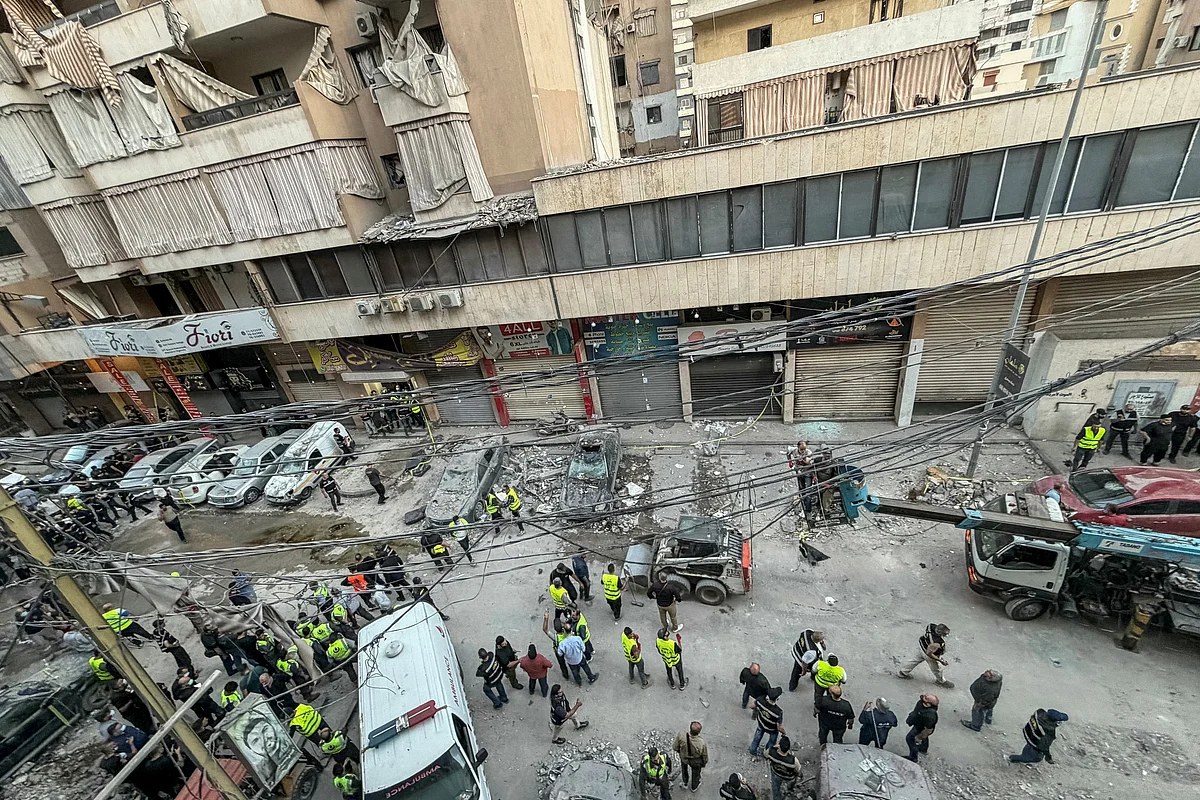Рабочие разбирают завалы на месте израильской воздушной атаки, целью которой было жилое здание в южном районе Бейрута Харет—Хрейк 23 ноября 2025 года. - AFP