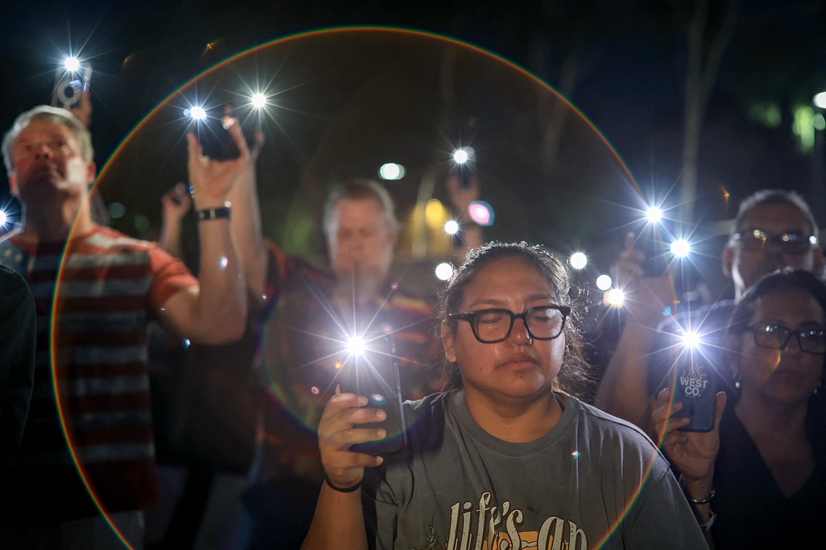 Люди держат в руках фонарики на своих телефонах и молятся во время панихиды по Чарли Кирку у здания штаб-квартиры Turning Point USA 19 сентября 2025 года в Финиксе, штат Аризона.