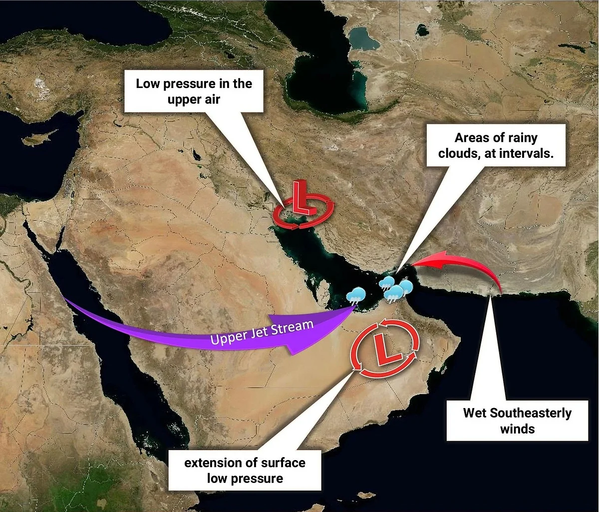 По данным Национального центра метеорологии (NCM), который уточнил, что это совпадет с распространением системы низкого давления в верхних слоях атмосферы, до 29 ноября на ОАЭ будет распространяться приземная система низкого давления, поступающая с юго-востока.