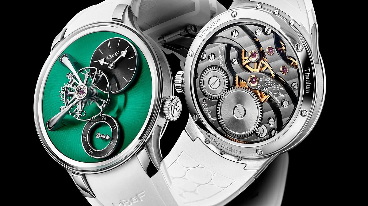 Выполненный из титана, новый LM101 EVO напоминает невесомую скульптуру, которая, кажется, дышит. Два цвета циферблата — лососевый на солнце и павлиний зеленый, каждый из которых создан с использованием технологии химического осаждения из паровой фазы, — переливаются под куполообразным сапфировым стеклом. Их цвета живые и постоянно меняются в зависимости от освещения. Два черных дополнительных циферблата — один для индикации времени, другой для определения запаса хода — обрамлены изящными серебряными кольцами, добавляющими четкости сказочному пейзажу. Под балансирами, словно мосты света, возвышаются двойные арки из зеркально отполированного металла, переосмысленные более мягкими изгибами.