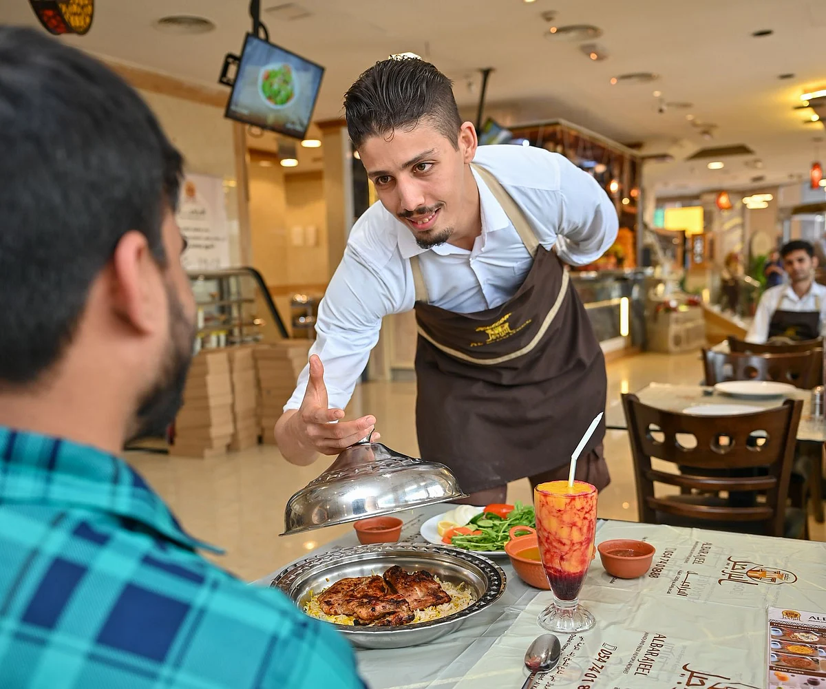 Ридван Дальфауи, официант ресторана Barajeel Mandi в Аль-Караме, подает еду одному из своих клиентов во время Рамадана. Фото: Мухаммад Саджад/KT