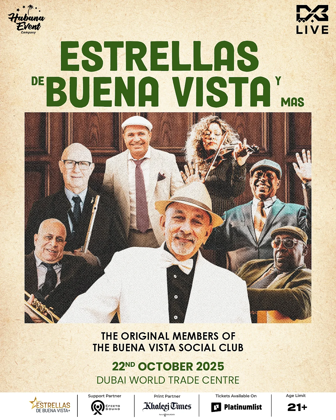 22 октября 2025 года во Всемирном торговом центре Дубая состоится концерт Estrellas de Buena Vista y Más, в котором примут участие участники легендарного клуба Buena Vista Social Club, и “Душа Гаваны” воспламенит Дубай.