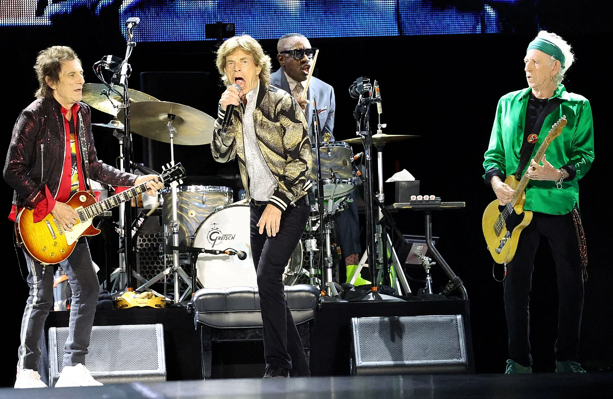 Мик Джаггер, Кит Ричардс и Ронни Вуд из английской группы The Rolling Stones выступают во время своего тура Hackney Diamonds на стадионе SoFi в Калифорнии, США, 10 июля 2024 года. Картинка предоставлена Reuters