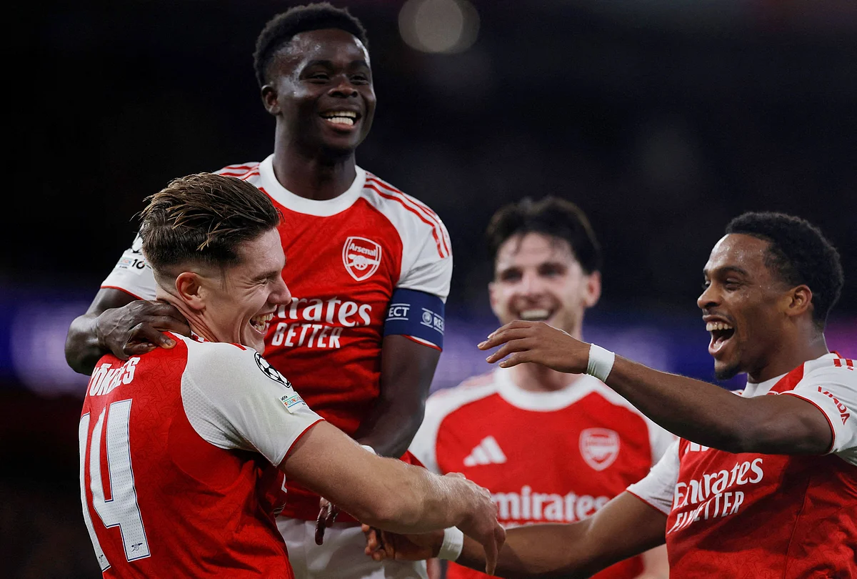 Нападающий "Арсенала" Виктор Гекереш празднует свой третий гол в составе Букайо Сака и Юррьена Тимбера. Картинка предоставлена Reuters