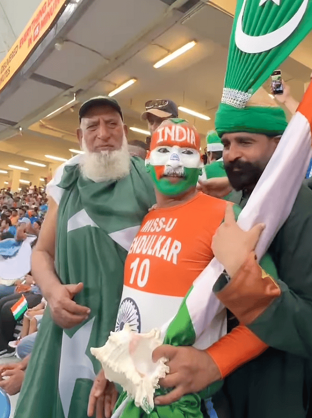 Трогательные снимки пакистанского суперфана Абдула Джалиля, известного в народе как “Чача Крикет” (Дядя Крикет), его соотечественника Фарука Анджум Шаха и известного индийского фаната крикета Судхира Кумара Чаудхари, пожимающих друг другу руки во время матча Индия-Пакистан в Дубае, стали вирусными.