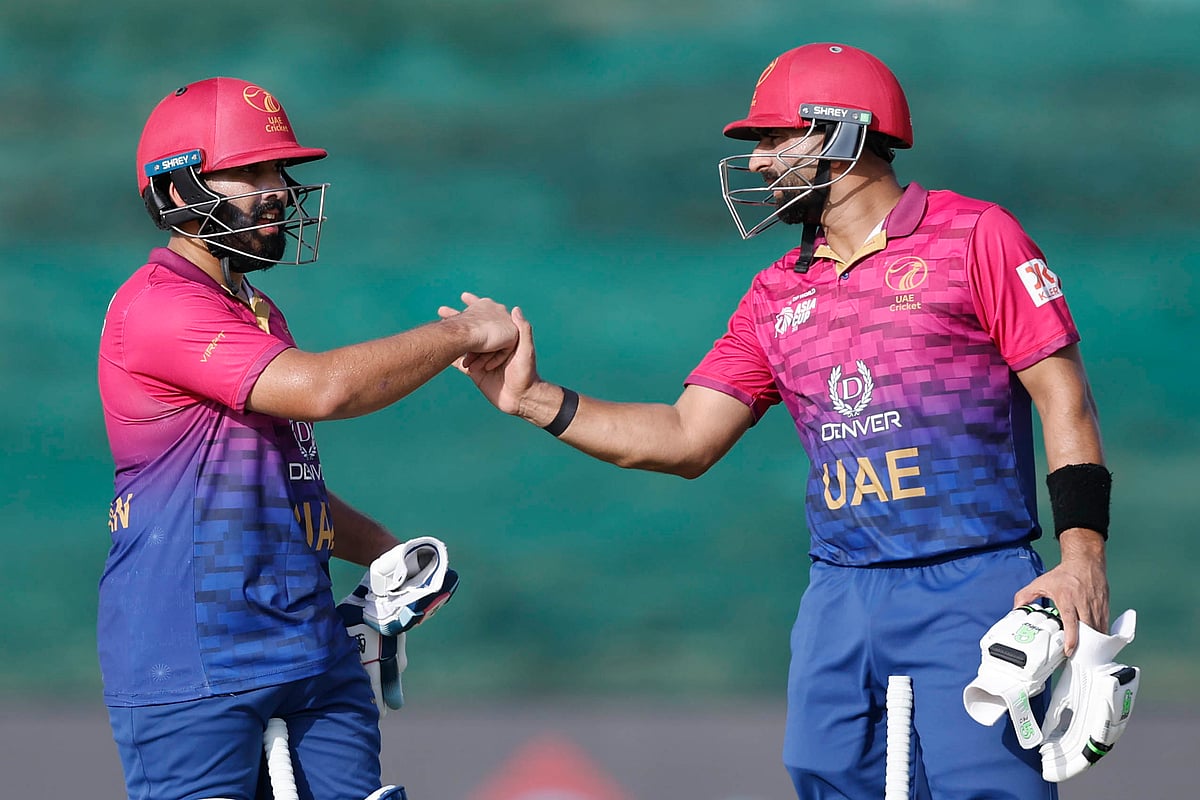 ОАЭ (возможно):1 Алишан Шарафу, 2 Мухаммад Васим (капитан), 3 Мухаммад Зохайб, 4 Асиф Хан, 5 Харшит Каушик, 6 Рахул Чопра (Великобритания), 7 Дхрув Парашар, 8 Хайдер Али, 9 Мухаммад Рохид Хан, 10 Мухаммад Джавадулла, 11 Джунаид Сиддик.