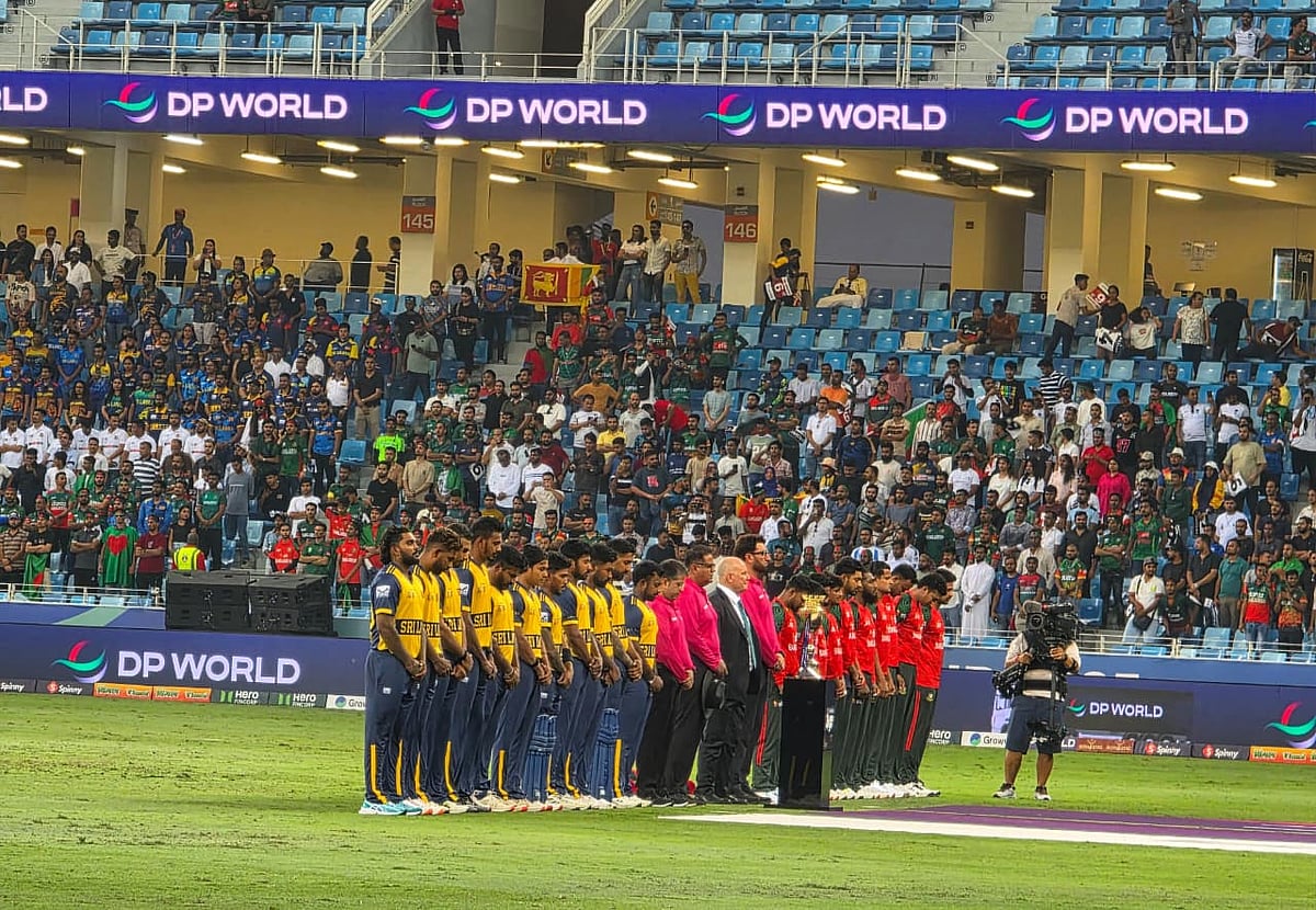 Игроки сборных Шри-Ланки и Бангладеш почтили минутой молчания память отца Веллаледжа перед началом матча в субботу.
