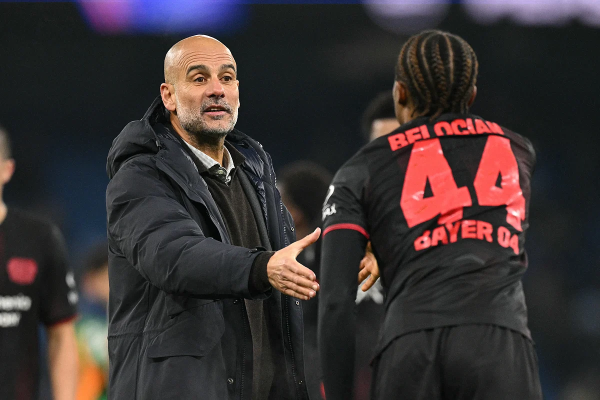 Главный тренер "Манчестер Сити" Пеп Гвардиола (слева) пожимает руку защитнику леверкузенского "Байера" Жануэлю Белочяну. Картинка предоставлена AFP