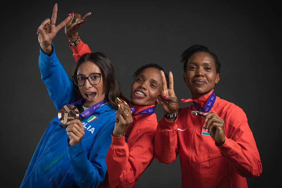 Бронзовая медалистка Надя Баттоклетти из Италии, золотая медалистка Беатрис Чебет из Кении и серебряная медалистка Фейт Кипьегон из Кении позируют после финала на дистанции 5000 метров среди женщин на чемпионате мира по легкой атлетике. Картинка предоставлена AFP