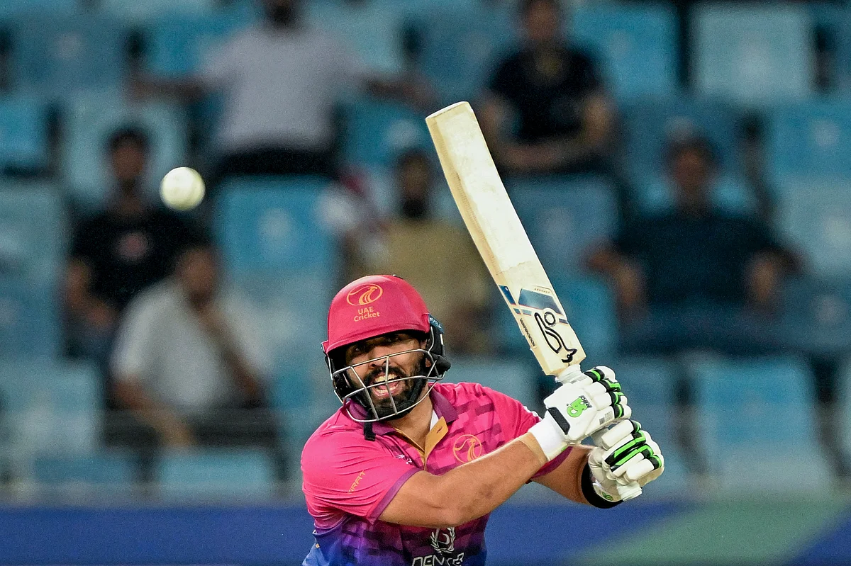 Алишан Шарафу из ОАЭ нанес удар во время матча Кубка Азии против Пакистана на международном стадионе Дубая 17 сентября 2025 года. Картинка предоставлена AFP