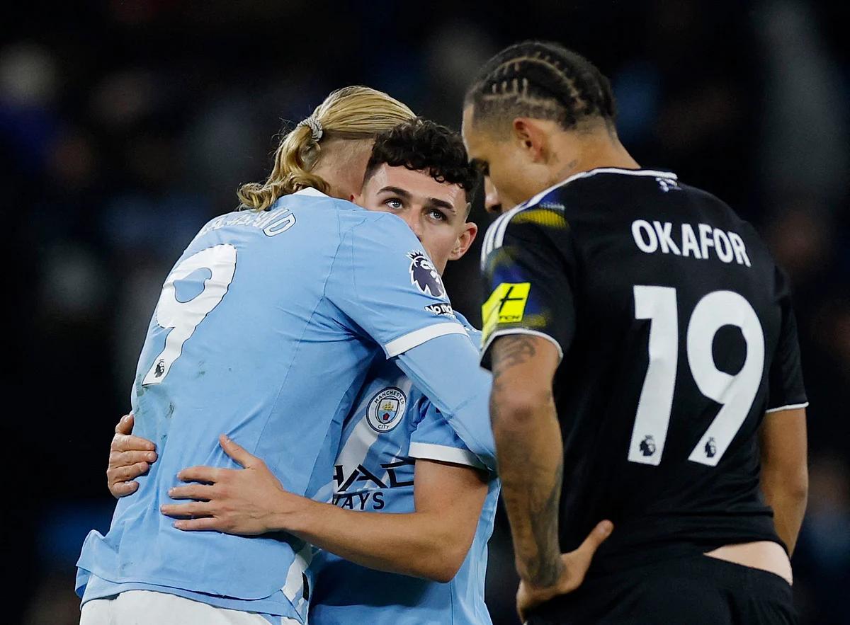 Эрлинг Хааланд из "Манчестер Сити" празднует победу вместе с Филом Фоденом после матча. Картинка предоставлена Reuters