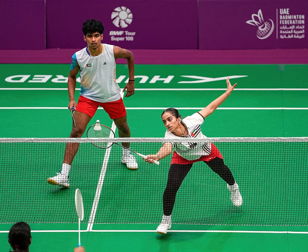 Дхирен Айяппан и Таабия Хан во время матча в смешанном парном разряде.  Картинка предоставлена Al Ain Masters
