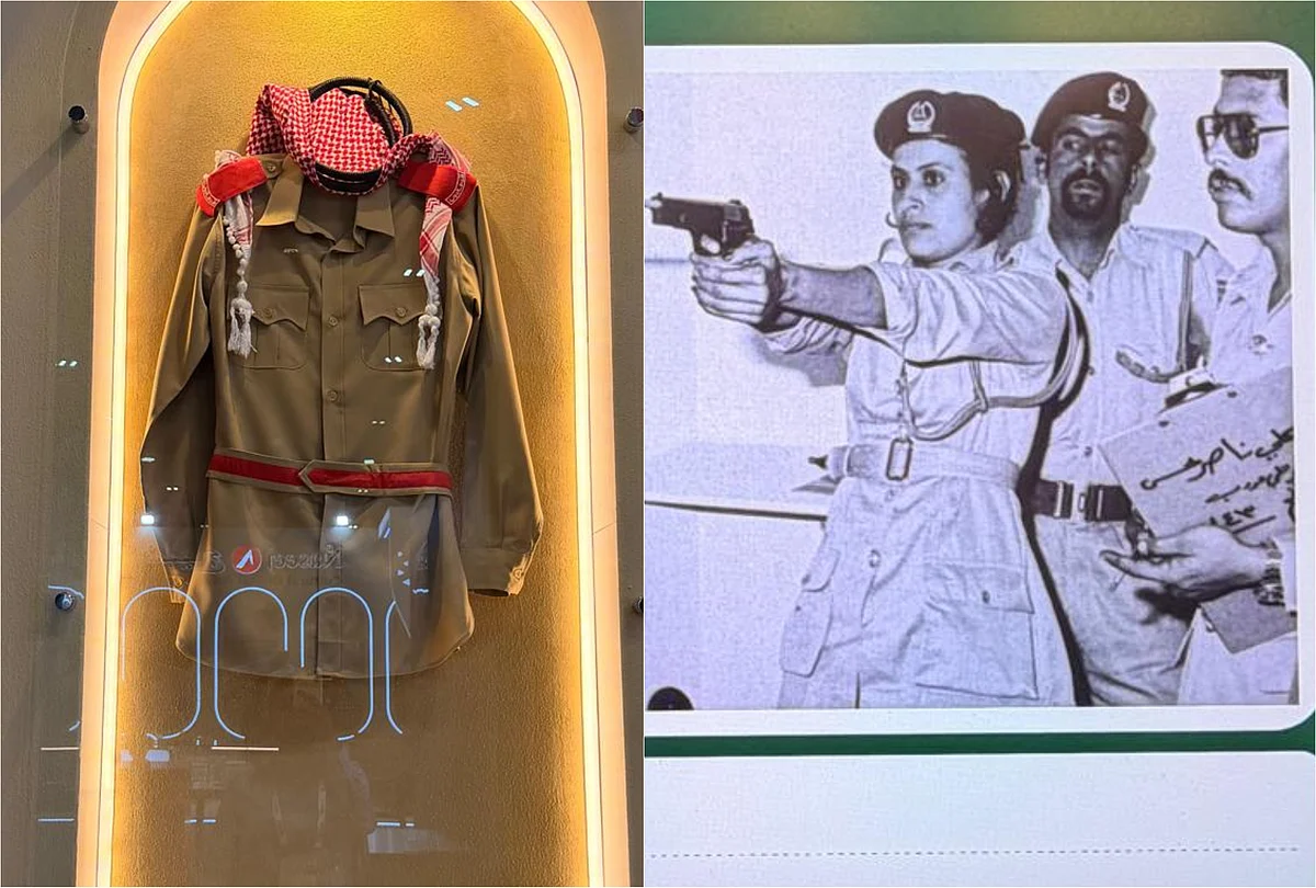 Экспозиция открывается простым, но выразительным изображением старой полицейской формы Дубая, рубашки цвета хаки в сочетании с красно-белой гутрой и веревочным агалом, аккуратно оформленными в теплых тонах. Рядом с ним висит нынешняя парадная форма, дизайн которой более структурирован, а знаки различия выполнены из полированного золота. Вместе они демонстрируют почти семь десятилетий службы и дисциплины.