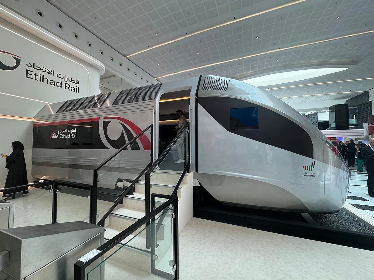 На Всемирной железнодорожной конференции в Абу-Даби компания Etihad Rail впервые представила свои долгожданные пассажирские поезда. На выставке была представлена модель серебристой кабины поезда с культовым черно-красным логотипом Etihad rail.