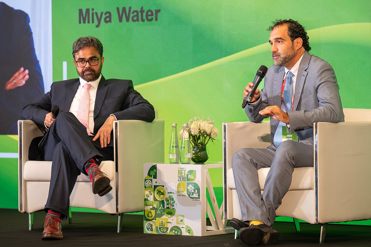 Ясир Ахмед, партнер и руководитель отдела по вопросам изменения климата и устойчивого развития EY MENA, и Ноам Коми, исполнительный председатель Miya Water, на главной конференции ОАЭ по борьбе с изменением климата "Путешествие к чистому нулю – ОАЭ 2025", организованной Khaleej Times в Дубае. 17 сентября 2025 года. Фотографии КТ: Шихаб